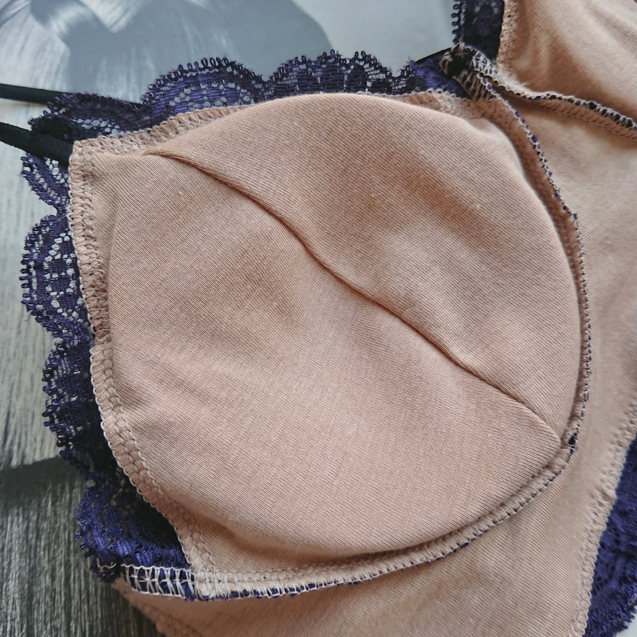バスト部分は国産モールドパットで、脇をシャープに、ほど良い丸みと高さのあるパットを使用。