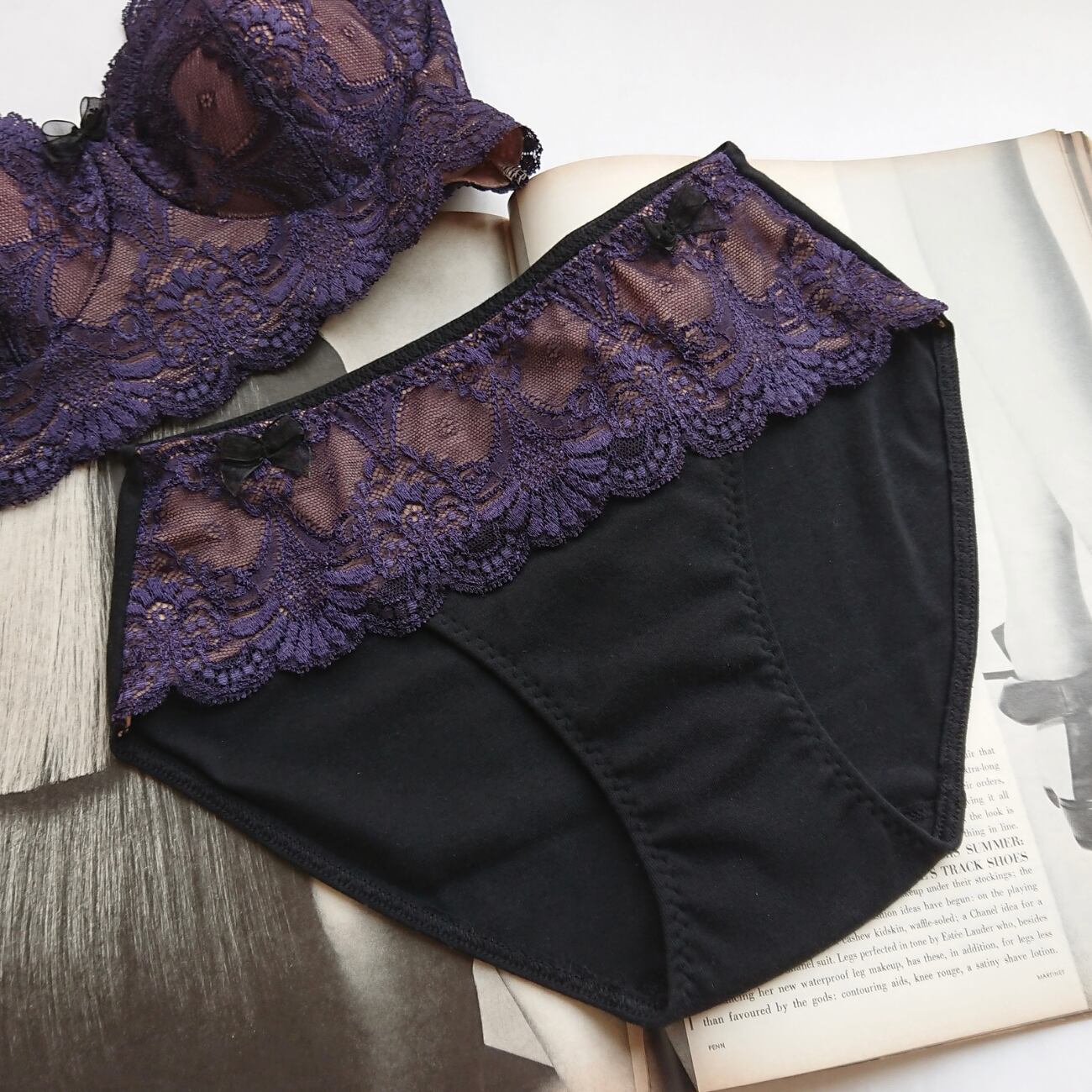 カラーは、レース部分がダークパープル、レース裏地コットン部分はモカ、